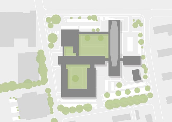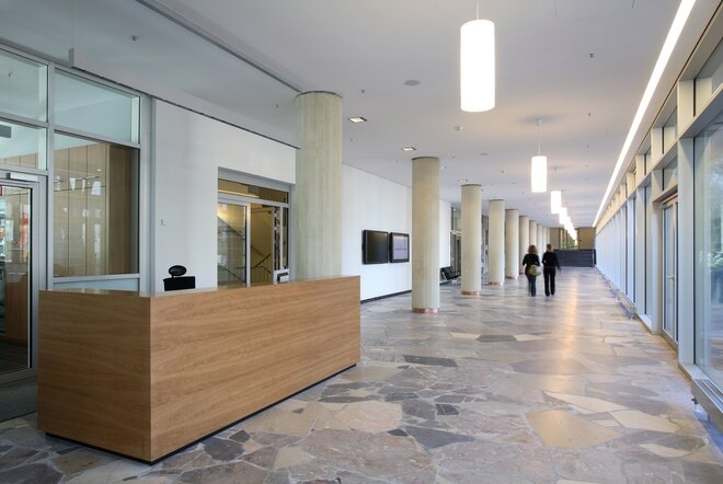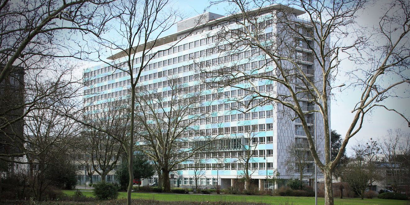 Zunächst wurde das Hochhaus und das Rechenzentrum saniert. Die Eingangshalle und die beiden Haupterschließungen mit schönen Treppenhäusern sowie zwei funktionstüchtigen Paternosteraufzügen bleiben unverändert. Das charak­teristische 50er Jahre Flugdach des Hochhauses wurde in seiner Wirkung wiederhergestellt.