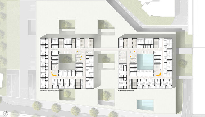Zwei Pflegewürfel sitzen auf dem eingerücktem Technikgeschoss: Je Würfel eine Pflegestation und vier Pflegeebenen. Die Pflegewürfel sind als ringartige Struktur um einen Innenhof organisiert. Alle Pflegezimmer der Allgemeinpflegestationen der verschiedenen Fachdisziplinen liegen an den Außenfassaden mit schönem Ausblick. Alle Funktions- und Nebenräume sind entlang der Innenhoffassaden geplant.