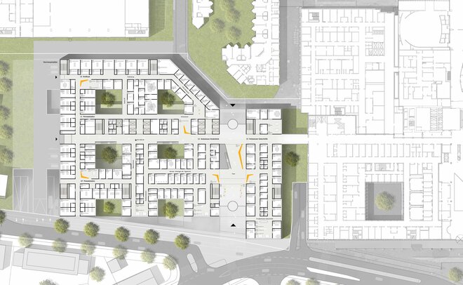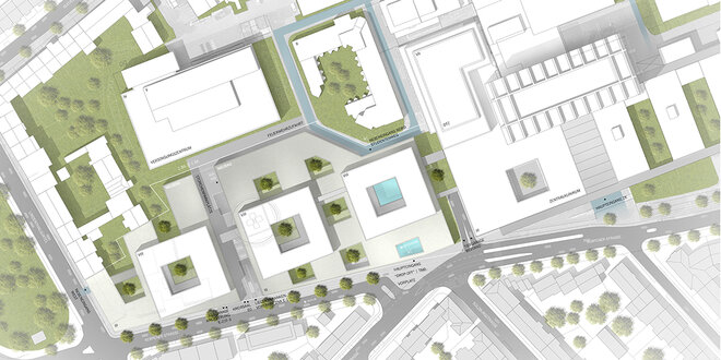 Der Entwurf entwickelt sich als (Kon)Sequenz aus dem Bestehenden. In klarer Reihung entsteht so eine kraftvolle innerstädtische Ordnung mit drei identischen Körpern.