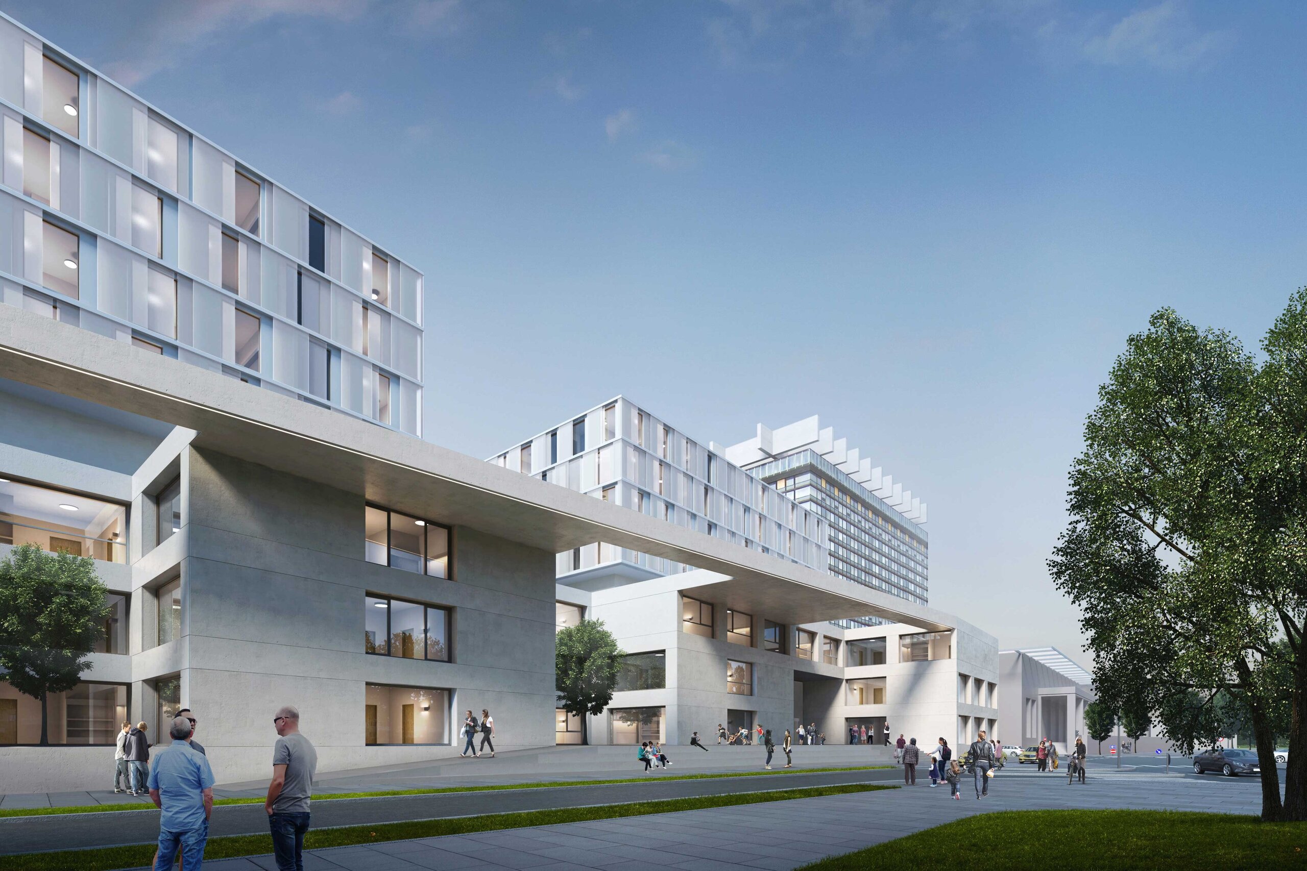 Dort wo sich der Straßenraum erweitert geht es über einen Vorplatz zum Haupteingang. Der untere Baukörper - ein dreigeschossiger Gebäudesockel mit einem Untergeschoss für die zentralen medizinischen Funktionen der Frauen- und Kinderklinik. Die klare Organisation des Sockels mit schmalem Dreibund ermöglicht ein flexibles Reagieren auf unterschiedliche Nutzeranforderungen.