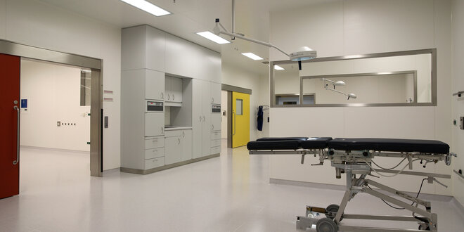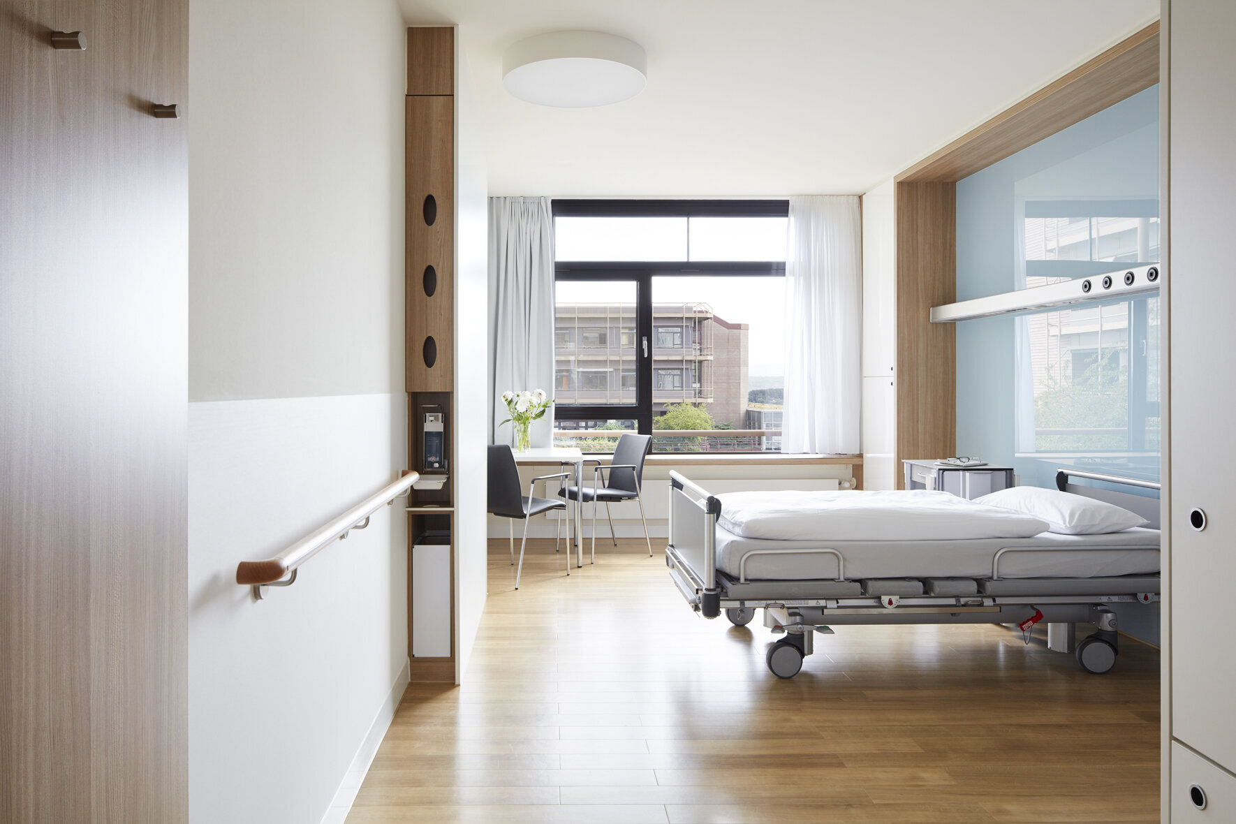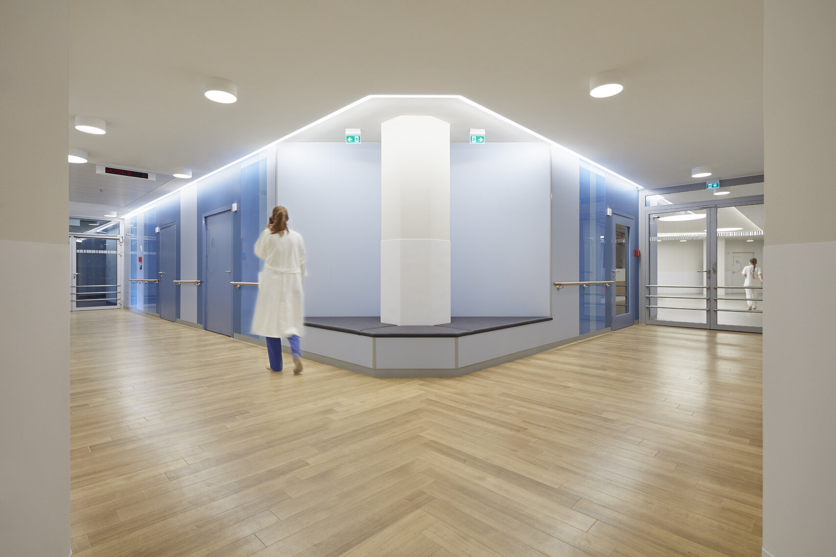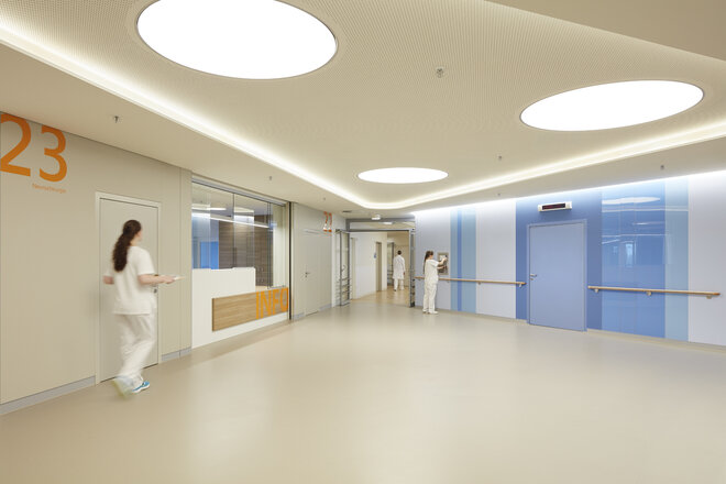 Die Patientenzimmer orientieren sich nach außen zum Grünen, die Arzt- und Pflegeräume zum neu entstandenen Innenhof. In der Mitte des Gebäudes ist eine attraktive Aufenthaltszone entstanden, die im Erdgeschoss den Zugang auf eine Außenterrasse ermöglicht. Die Erweiterung des OP-Traktes fand bei laufendem Betrieb statt.