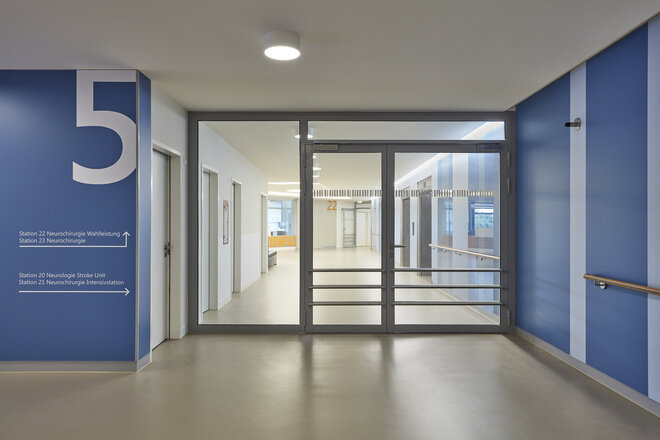 Im Gestaltungskonzept nutzen die Innenarchitekten von a|sh die psychologische und heilungsfördernde Wirkung der Farben. Weiß und Blautöne stehen für Ruhe, Weite und Konzentration. Sie sollen kühlend und schmerzlindernd wirken und sich positiv auf das vegetative Nervensystem auswirken. Als warmen Kontrast dazu werden Holzdekore in heller Eiche verwendet und sorgen für Geborgenheit und eine wohnliche Atmosphäre. In jedem Innenraumkonzept von a|sh spielt der Ort und die Identifikation eine besondere Rolle. Motive aus der Tübinger Umgebung wie Landschaften oder die Stadtmauer von Tübingen werden für eine gesamtheitliche Orientierung- und Informationsarchitektur in der Klinik eingesetzt.
