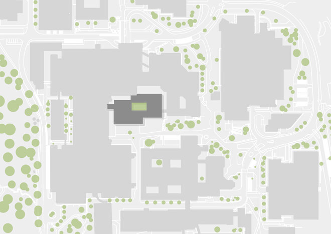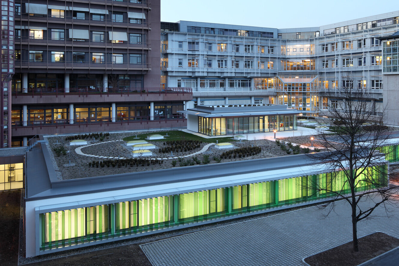 Im Universitätsklinikum Tübingen wurden die bestehenden Intensivstationen in den Crona-Kliniken durch den Neubau einer Intensivstation ersetzt. Als Standort wurde der Innenhof der Crona/Kinderklinik gewählt. Dadurch ergibt sich eine optimierte Raumfolge OP-Aufwachen-Intensivstation auf einer Ebene.