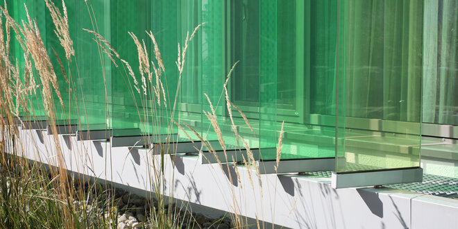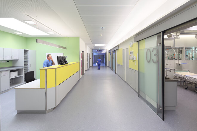 Auf der klinikinternen Straße wurde ein optimierter Sichtschutz angebracht. Hierfür wurden vor allen Patientenzimmern farbige, senkrechte Glaslamellen als äußerer Sichtschutz angeordnet.
