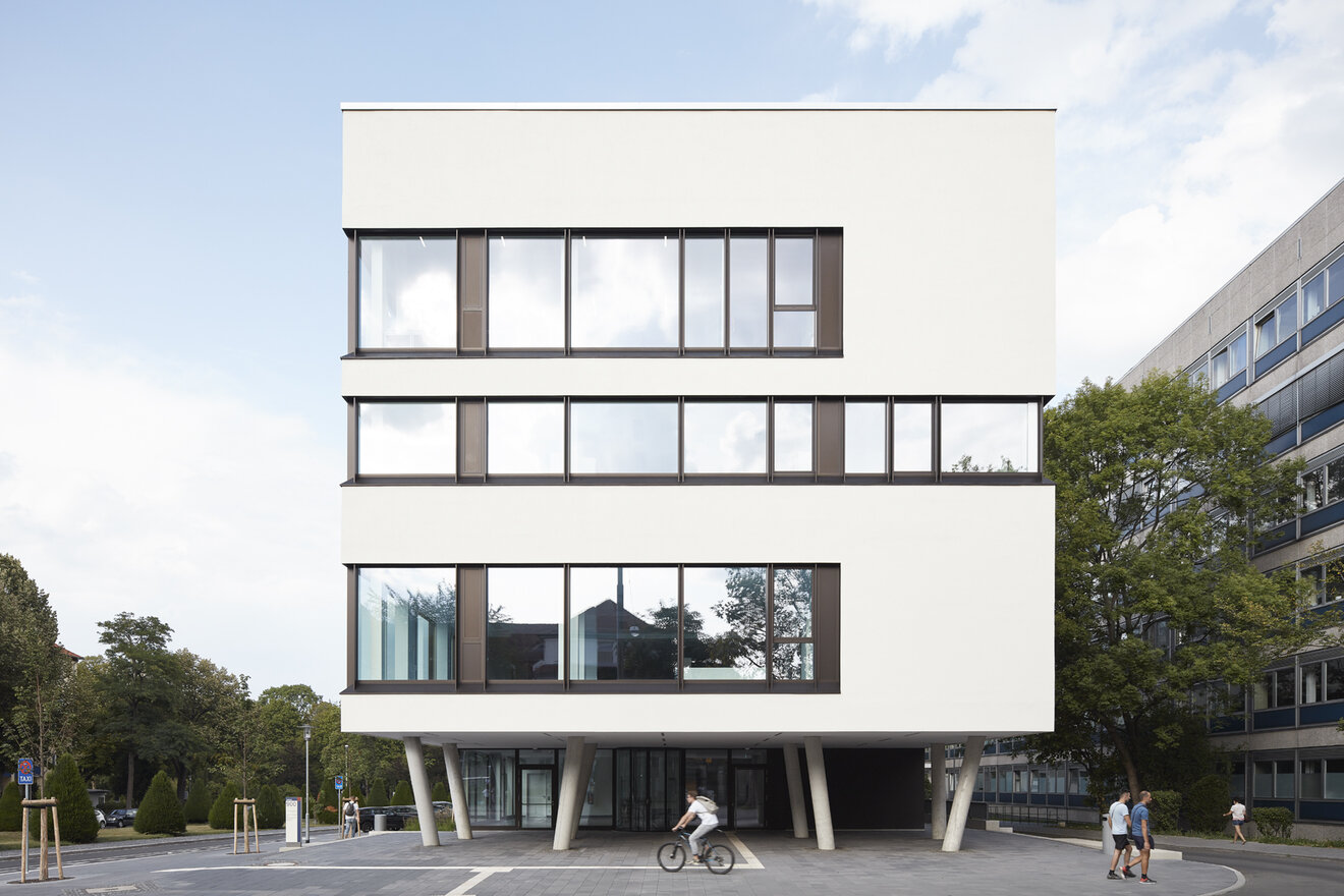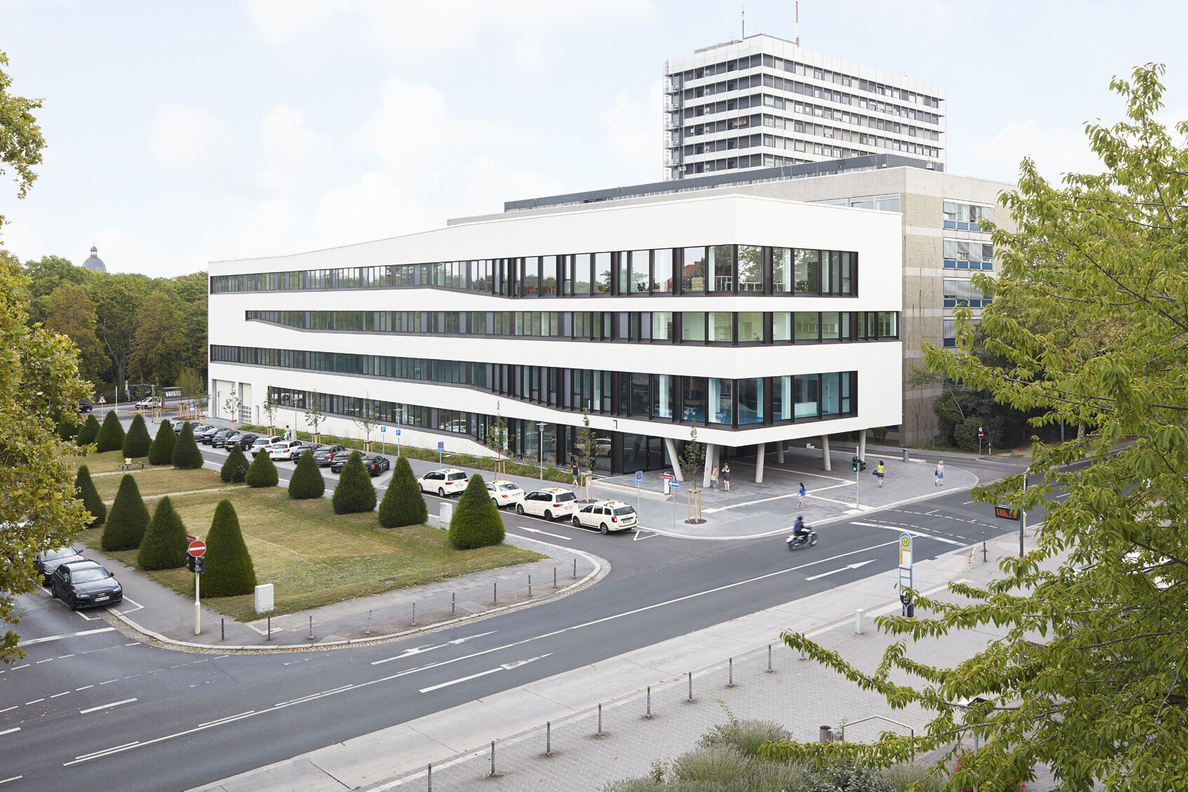 Die Gebäudekonzeption folgt der architektonischen und nutzungstechnischen Leitidee: Eine einfache und klare Geste, die als neuer Baustein des großen Campus‘ einen eigenständigen Identifikationsort schafft. Der Neubau überdeckt das in Ost-West-Richtung verlaufende Grundstück fast vollständig. Auf die zentrale Position antwortet er mit einer horizontalen und bandartigen Fassadenstruktur, die zur markanten Platzecke ansteigt. Seine nördliche Längsseite rahmt mit der gegenüberliegenden Wohnbebauung den Augustusplatz. Durch das rückversetzte Erdgeschoss entsteht eine durchlässige Zone mit schräggestellten Stützen, die sich zum Platz und zum Hauptgebäude öffnet. Die Obergeschosse kragen markant in den Straßenraum und kommunizieren optisch mit dem Haupteingang zum Campus.