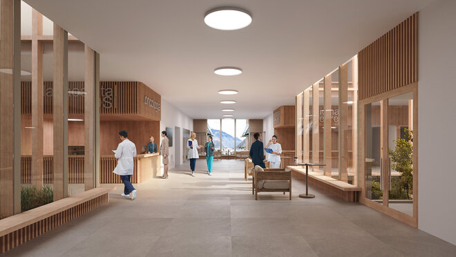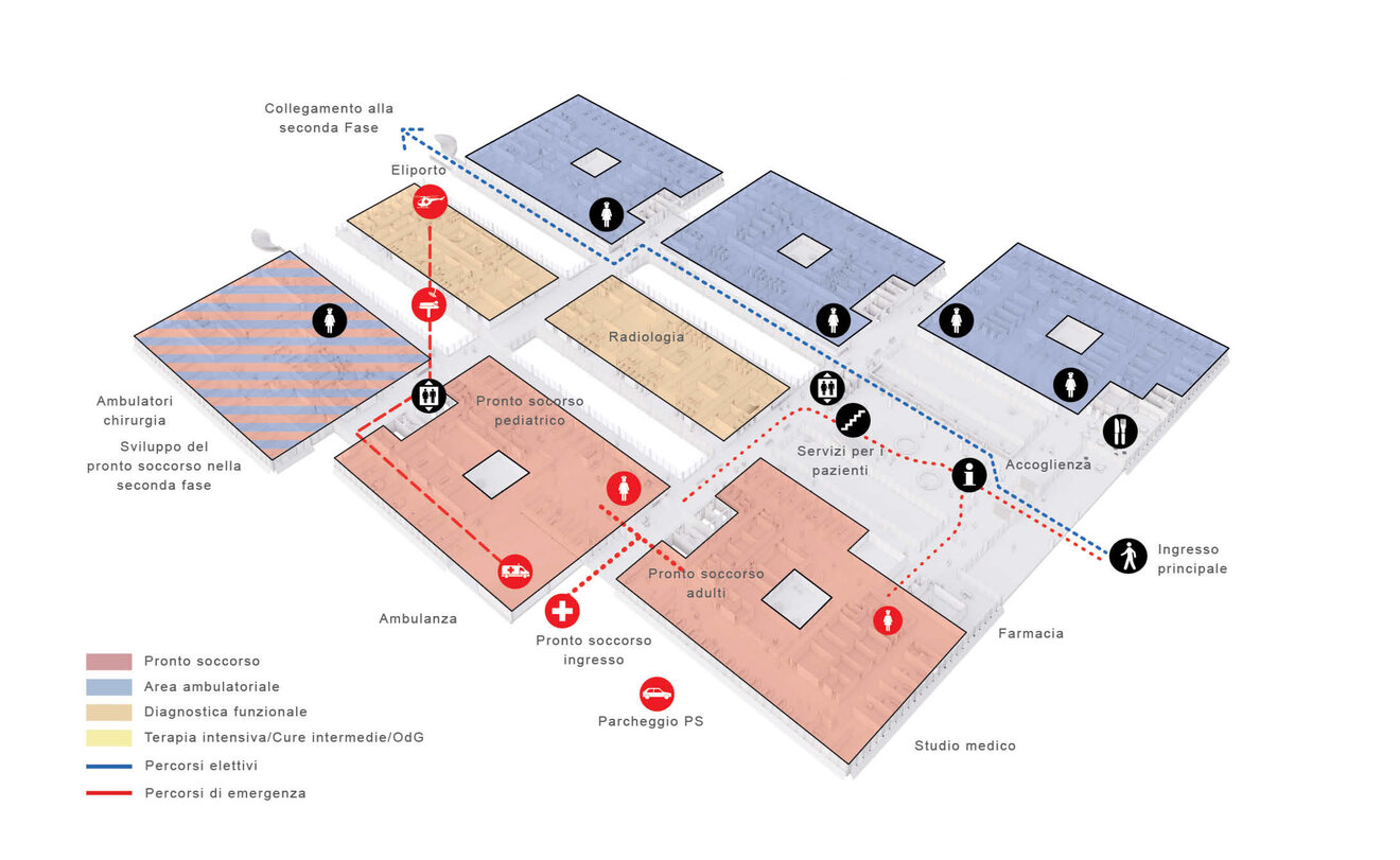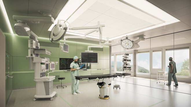 Geeignet für Diagnostik, Therapie und Pflege verschiedener Intensität, sowie auch High End Medizin, bilden die modularen Einzelbaukörper eine städtische Struktur und tragen zur Reduzierung der massiven Wahrnehmung des Gebäudevolumens bei. Dies verleiht dem Krankenhaus ein einladendes Erscheinungsbild. Dank der hohen Modularität können Operationssäle genauso erweitert werden wie hochwertige Untersuchungs- und Behandlungsbereiche.