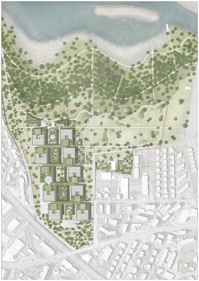 Der Entwurf sieht vor, dass sich die Gebäudeteile entlang einer Nord-Süd Achse orientieren und auf die natürlichen Bewegungen des umgebenden Parks und des Flusses reagieren. So fügt sich das neue Krankenhaus harmonisch in den umgebenden Kontext ein.