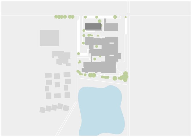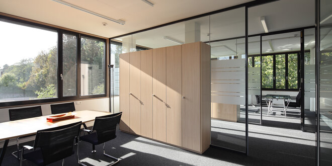 Die einzelnen Büroräume im Erdgeschoss werden vom Foyer aus über einen zentralen Flur erschlossen, im Obergeschoss setzt sich der Treppenlauf in den Flur der Bürozone fort. Im Erdgeschoss befinden sich zusätzlich ein repräsentativer Personalaufenthaltsraum, sowie Sanitär-, Technik- und Nebenräume. Eine ähnliche räumliche Struktur findet sich im zweiten Obergeschoss. Neben dem Personalaufenthaltsraum und den Sanitär-, Lager- und Nebenräumen ist auf der Galerie über dem Haupteingang ein Besprechungsraum angeordnet.