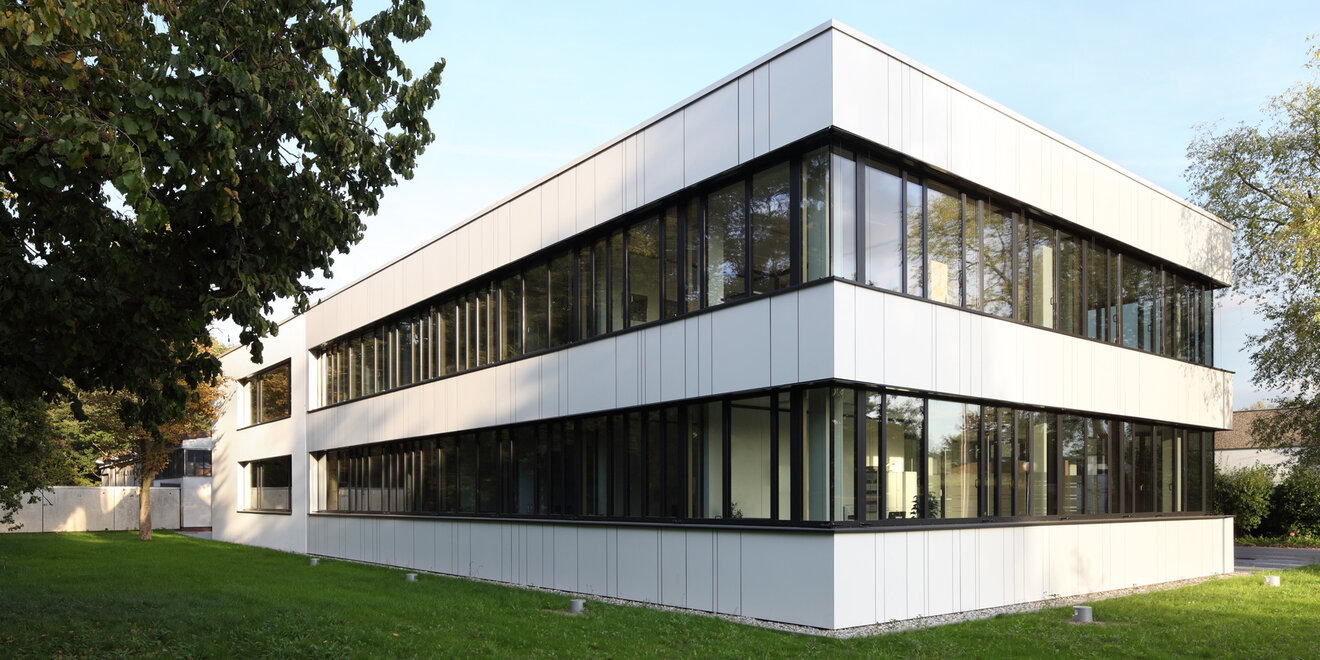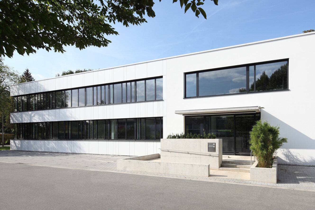 Das neue Verwaltungsgebäude wurde als Stahlbetonbau mit extensiv begrüntem Flachdach verwirklicht. Im Zugangs- und Erschließungsbereich erhielt er eine Fassadenverkleidung mit Wärmedämmverbundsystem, die Bürobereiche heben sich davon mit einem umlaufenden Fensterband und einer hinterlüfteten faserverstärkten Harzkompositplattenfassade in unterschiedlichen Breiten ab.