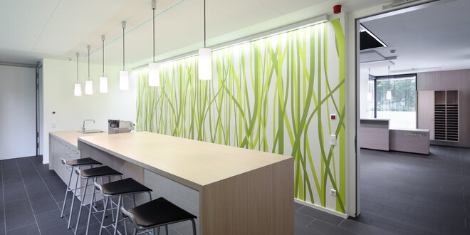 Das über 30 Jahre alte Verwaltungsgebäude der WfB Rhein-Main wies massive bauliche, energetische und räumliche Mängel und bot in den Raumzuordnungen keine weiteren Entwicklungsmöglichkeiten für die Zukunft. Am Standort des alten Verwaltungsgebäudes wurde daher ein zweigeschossiger Neubau umgesetzt, in dem 20 moderne Büroarbeitsplätze in Einzel- und Doppelbüros Platz finden.