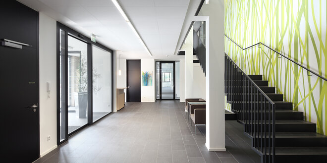 Die Erschließung des Gebäudes erfolgt über einen behindertengerechten Haupteingang, an den sich das großzügige Foyer mit einer offenen Treppe und einem Aufzug anschließt.