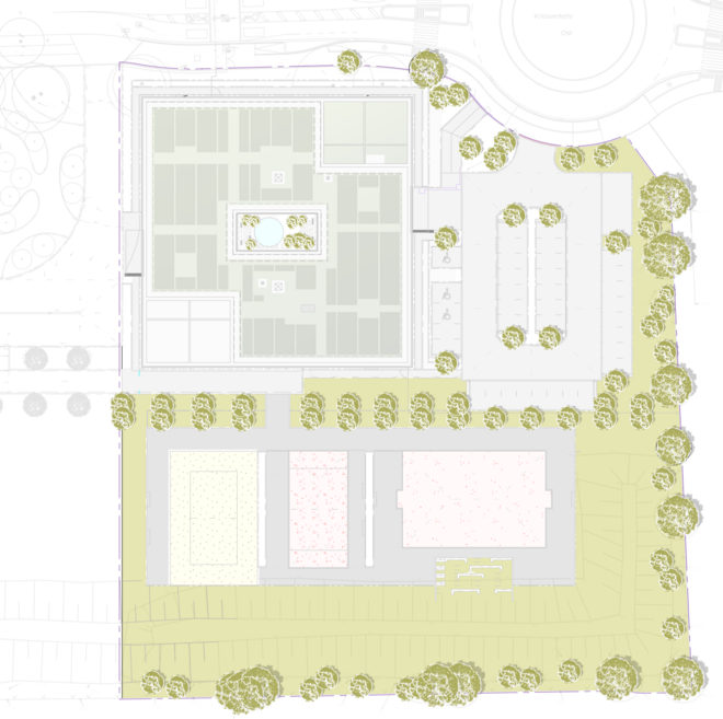 Das Motiv des Quadrats findet sich sowohl im Grundriss als auch in den Fassadenöffnungen wieder. In den Obergeschossen wird jeweils eine Gebäudeecke des Kubus ausgespart und als Dachterrasse bzw. Gründach genutzt. Horizontale Brandsperren vervollständigen in diesen Bereichen optisch die Kubatur. Während die geschossweise Bänderung sowie die Vordachgestaltung Elemente der Bestandsgebäude aufgreifen, vermittelt die Holzfassade die Andersartigkeit der Nutzung. Sonnen- und Blickschutzelemente treten je nach Nutzung aus der Fassadenebene hervor und tragen im Winter zur Reduzierung der Wärmeverluste bei. Einzelne Bereiche öffnen sich über eine Pfosten-Riegel-Konstruktion zum Außenraum und ermöglichen eine gebäudeübergreifende Kommunikation. Die Begrünung des Photovoltaikdaches sowie eine Berankung der Outdoor-Sportterrasse als Gestaltungselement sorgen für Verdunstungskühlung im Sommer.