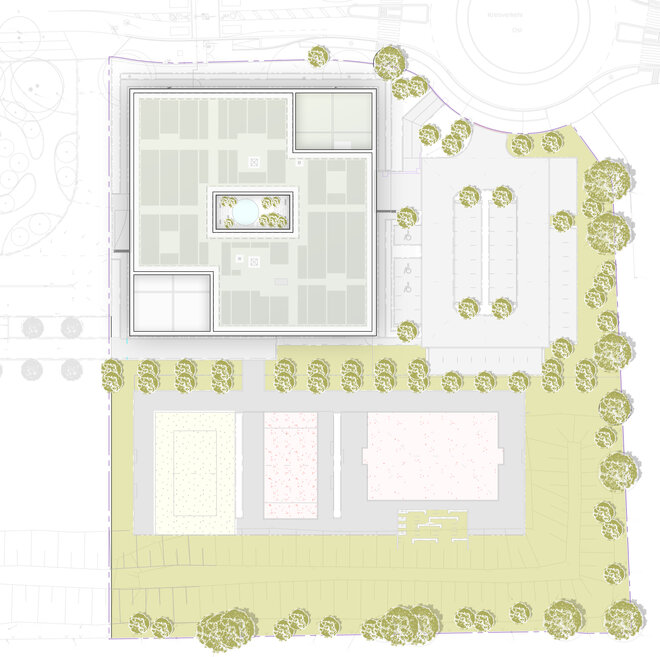 Zwei voneinander unabhängige Eingänge erschließen das multifunktionale Gebäude mit einer Bruttogeschossfläche von rund 5.400 m² sowohl von werksinterner als auch von öffentlicher Seite. An den Eingängen führen über den zentralen Innenhof natürlich belichtete Erschließungsflure zu den jeweiligen Treppenhäusern und Aufzügen. Ein zentraler Empfang mit Blick in den begrünten Innenhof bildet den Auftakt zu den auf drei Ebenen verteilten Praxisflächen im nördlichen Gebäudeteil. Die allgemein- und betriebsmedizinischen Praxen bilden mit den psychologischen, orthopädischen und physiotherapeutischen Praxen sowie weiteren Behandlungs- und Beratungsräumen wertvolle Synergien, die eine effektive Raumnutzung ermöglichen. Ein Flex-Bereich im zweiten Obergeschoss nimmt gemeinsame Büro-, Pausen- und Nebenräume auf.