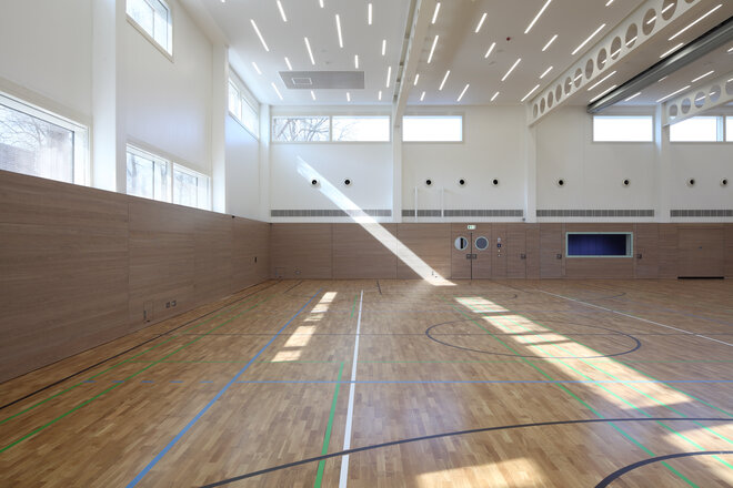 Für die vielseitige Nutzung – von Therapien bis zu Symposien – wurde ein flexibles Beleuchtungskonzept entwickelt. In die Fensterbänder integrierte LED-Linien ermöglichen individuelle Lichtstimmungen, die farblich und rhythmisch auf jede Veranstaltung abgestimmt werden können. So wird die Halle nicht nur zu einem Ort der Bewegung, sondern auch der Begegnung.
