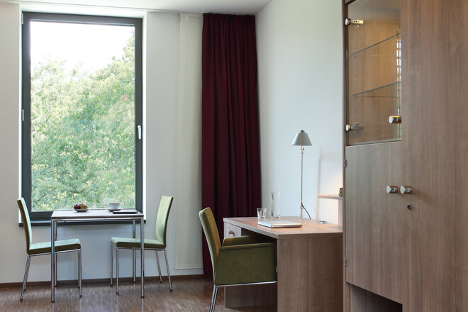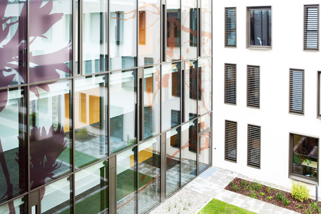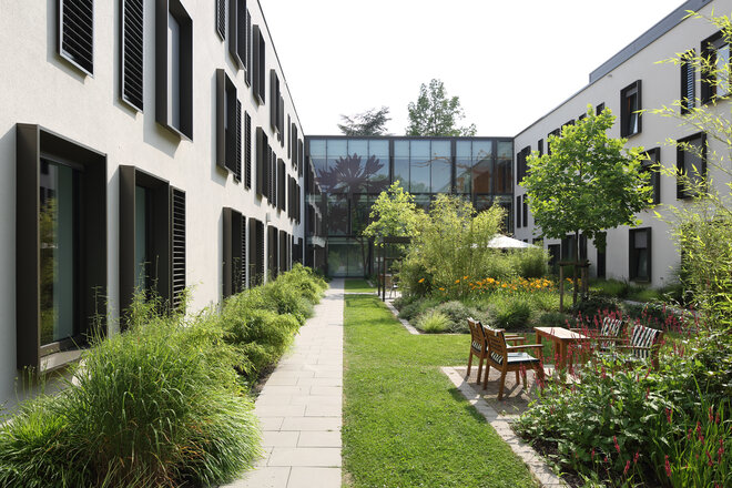 Helle, freundliche Materialien prägen die Innenräume schaffen eine Atmosphäre, die eher an ein Hotel als an eine Klinik erinnert. In Materialität und Farbgebung fügen sich Möbel harmonisch in das Gestaltungskonzept ein: Subtile Farb- und Pflanzenmotive gliedern die einzelnen Bettenhäuser und verleihen der klaren Architektur eine spielerische Note. Gleichzeitig dient das Konzept als intuitives Signaletik-System und erleichtert Patient:innen und Besucher:innen die Orientierung im Haus. Neben der offenen und transparenten Gestaltung schafft die Architektur bewusst auch geschützte Bereiche. Therapiegärten mit Obst- und Gemüsebeeten bieten Rückzugsorte und ermöglichen zugleich die aktive Teilhabe am Klinikalltag.