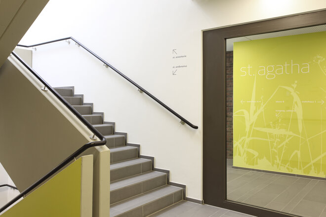 Die ehemalige Außenfassade der Kapelle wurde in den Neubau integriert und bildet heute als Innenwand und Teil der zentralen Magistrale den räumlichen und symbolischen Mittelpunkt der Anlage. Eine schmale Glasfuge sorgt für natürliche Belichtung und schafft einen atmosphärischen Übergang zwischen Alt und Neu.