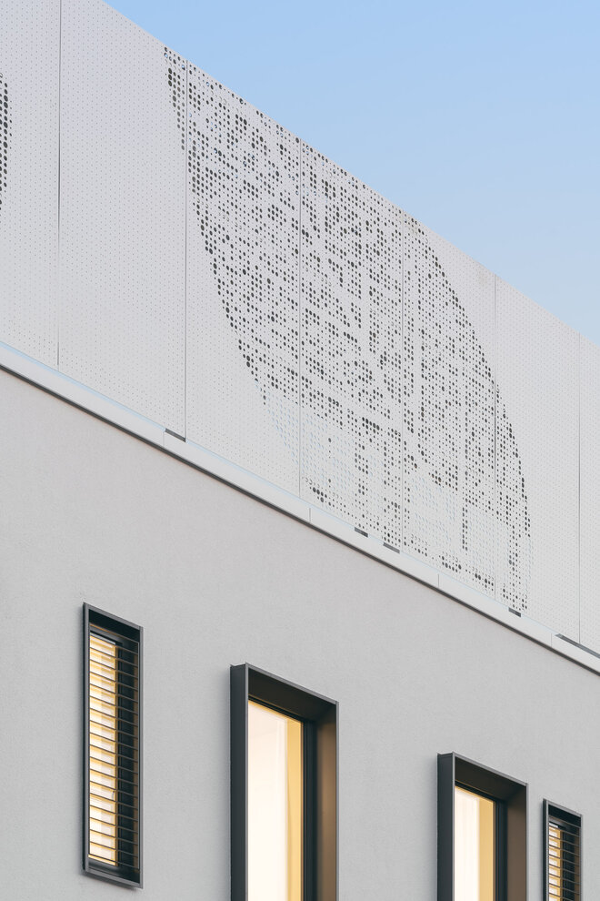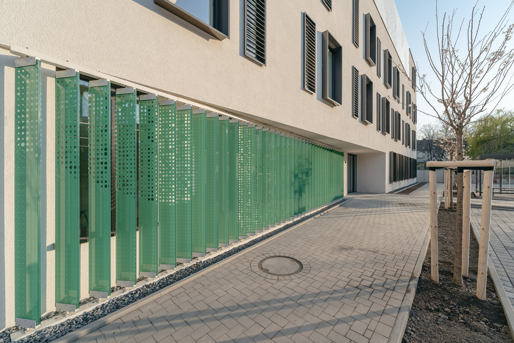 In ihrer Ausprägung, Farbigkeit und Materialität nimmt die Lochfassade die Gestaltung des Bestandes auf und setzt den Ensemblecharakter der Krankenhausanlage fort. Modern interpretiert schaffen die hellen Putzflächen einen klaren Kontrast zu den anthrazitfarben eloxierten Alufensterrahmen. Schlank und hochkant ausgeführt bilden immer zwei Fenster eine Einheit.