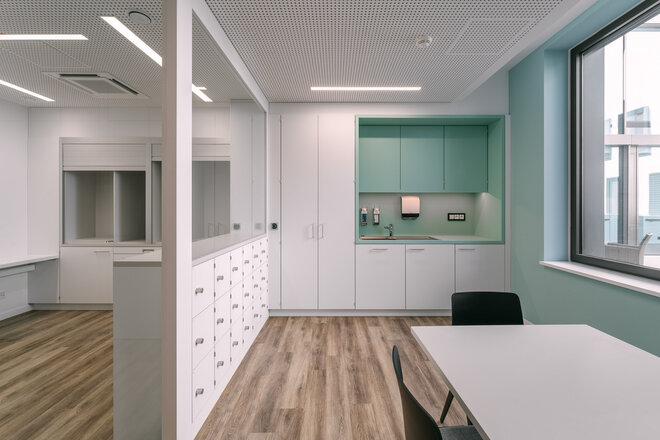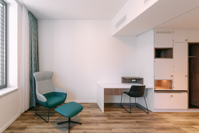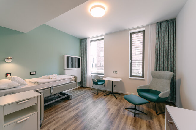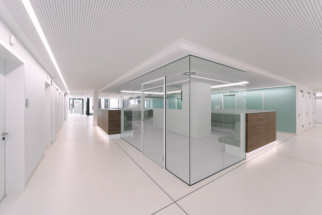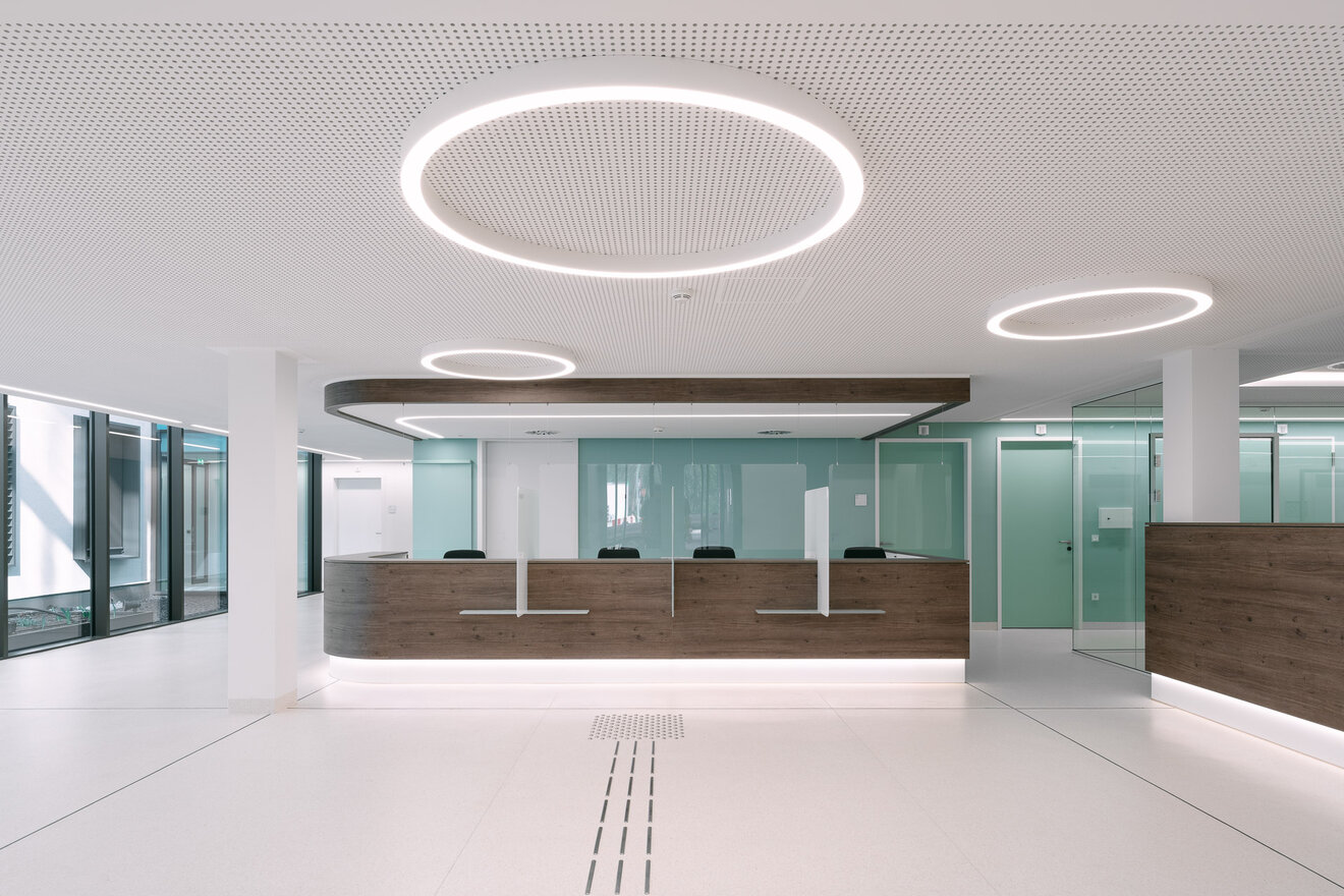 Sanftes bis kräftiges Grün an Wänden, in Stoffen und Glaselementen setzt auch in den weiß gehaltenen Innenräumen wohltuende Akzente. Fein aufeinander abgestimmt, vermitteln die Farbflächen Ruhe und Stabilität. Die Patientenzimmer – 13 Einzel- und fünf Doppelzimmer – sind angenehm und exklusiv mit Hotelcharakter ausgestattet. So werden die Patienten auch nicht an einem funktionalen Krankenhaustresen, sondern an einer Rezeption wie im Hotel empfangen.