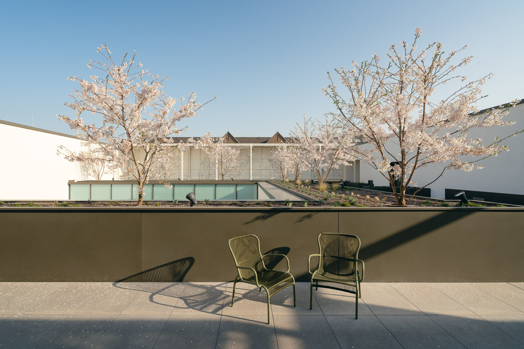 Ein verglaster Stahlfachwerk-Gang verbindet den Neu- mit dem Altbau. Mit Blattmotiven der Salbeipflanze bedruckte Glaslamellen in sanftem Grün dienen im Erdgeschoss als Sicht- und Sonnenschutz.