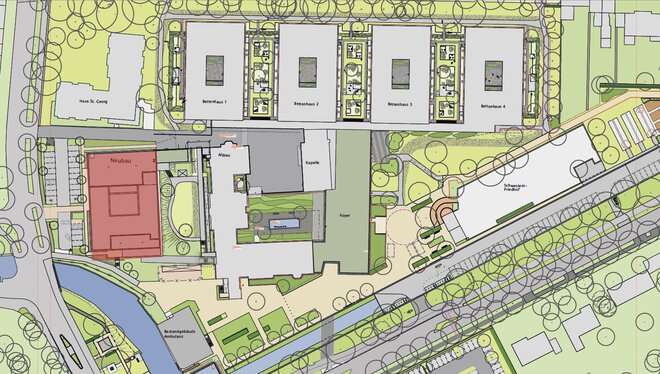 a|sh architekten planten ein kompaktes 3-geschossiges Atriumgebäude. Wie die Bettenhäuser organisiert sich der Baukörper um einen Innenhof, der die innenliegenden Räume natürlich belichtet und belüftet. Ziel war es, ein gutes Verhältnis zwischen Grünraum und Dichte sowie zwischen Schutz und Transparenz zu erzielen. Auf einer Nutzfläche von 3.224 m² sind drei Funktionseinheiten untergebracht: