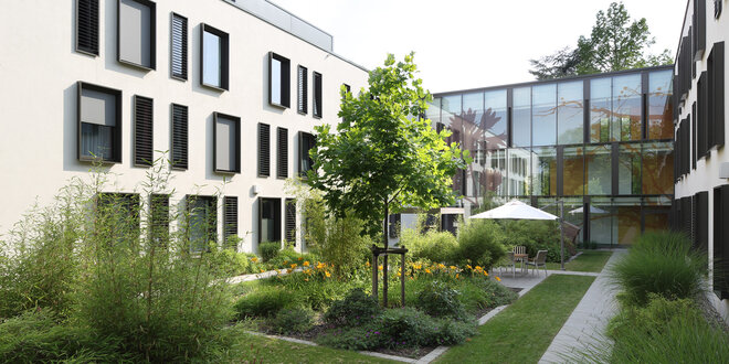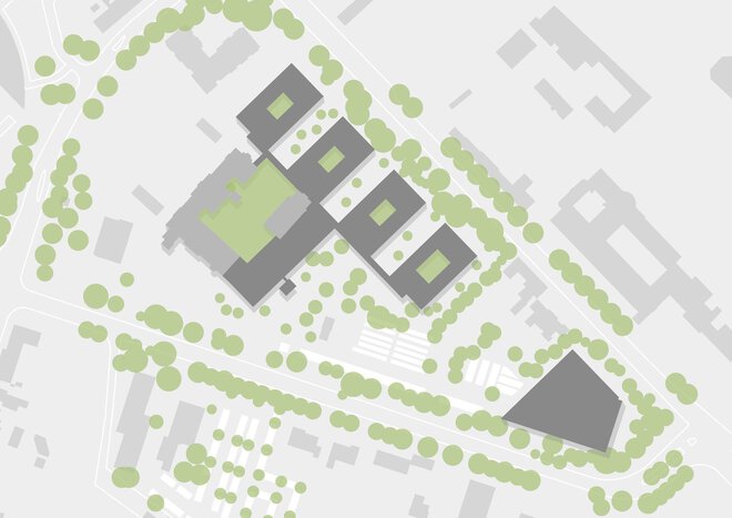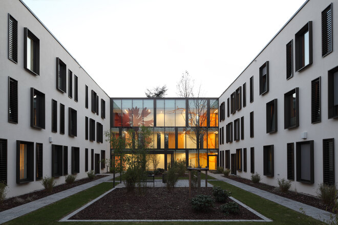Das Zentrum für seelische Gesundheit bildet eine große Einheit, die jedoch durch die Gliederung in Einzelbauteile den menschlichen Maßstab nicht verlässt: Die Patienten leben in Häusern mit kleinen Atrien. Die Gebäude selbst bilden einseitig offene Höfe, die den geschlossenen Stationen im Erdgeschoss den Blick auf unterschiedlich gestaltete Gärten ermöglichen.