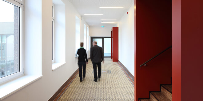 Die ehemalige Außenfassade der Kapelle wurde durch den Neubau zur Innenwand umfunktioniert und begrenzt heute Eingangshalle sowie Cafeteria, eine Glasfuge dient der natürlichen Belichtung der Magistrale und der Kapellenfassade mit ihren Buntglasfenstern. Die Kapelle ist nun Mittelpunkt der Gesamtanlage am Kreuzungspunkt zur Quermagistrale, die das Gebäude für die Verwaltungs- und Therapieeinheiten mit den vier Bettenhäusern verbindet.