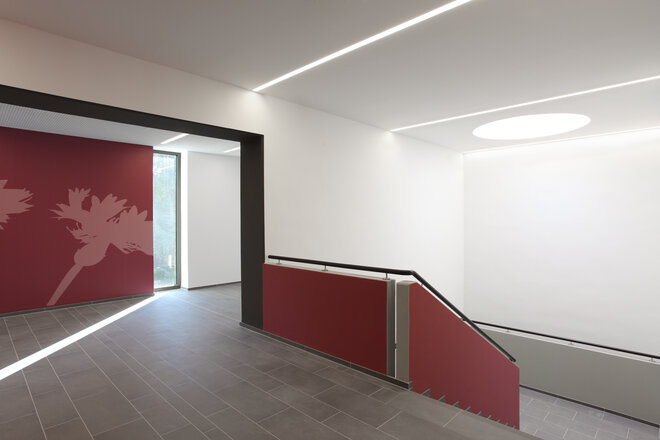 Jedes Bettenhaus wird durch eine Pflanze in einem eigenen Farbton repräsentiert. Den Pflanzen Ginkgo, Bambus, Platane und Kornblume sind die Farben Gelb, Grün, Orange und Malve zugeordnet. Die vegetativen Formen in ihren vier Farben werden punktuell und gezielt als Wandflächen oder semitransparent folierte Glasflächen sichtbar und verleihen so der schlichten und klaren Formensprache des Bauwerks etwas Spielerisches.