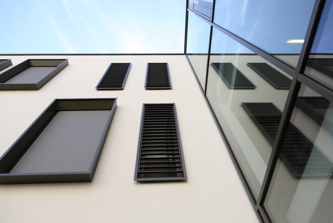 Die cremefarbenen Vollwärmeschutzfassaden der Bettenhäuser mit den spielerisch gestalteten Lochfenstern und dem Farbspiel der unterschiedlich farbigen Glasplatten stehen im Gegensatz zu den großzügigen Aluminium-Pfosten-Riegel-Fassaden an der Magistrale sowie an den Atrien. So entsteht ein reizvolles Zusammenspiel von geschlossenen und offenen Wandelementen.